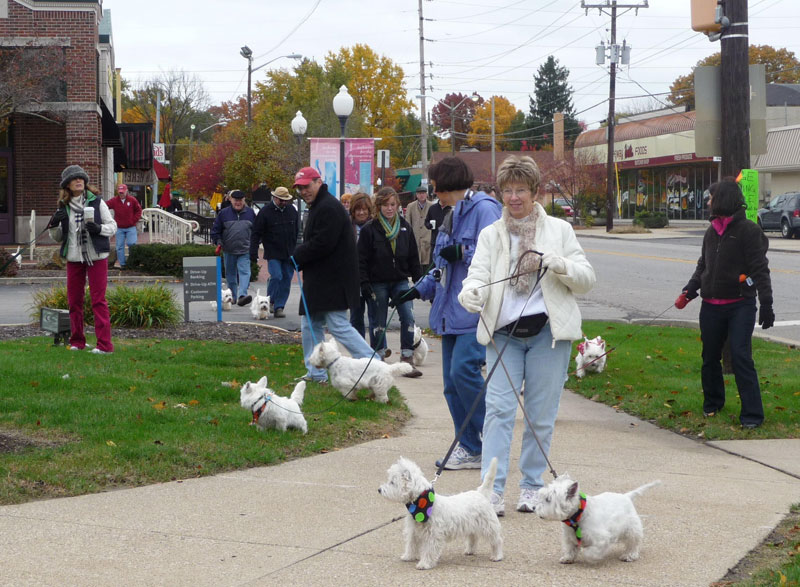 Last issue I asked what could be more fun than a beauty contest for Bull Dogs when writing about Butler University. I suggested a Westie Walk and said I would write about it in a future column. On Saturday, October 24th, my out-of-their-minds-over-their- West Highland White Terrier- neighbors, Sarah and Bill Brown, hosted the first Westie Walk in Indianapolis. No question, these dogs are adorable (their's in particular, I agree). This event started at 56th & Illinois led by a bagpiper past all the shops to the canal path and beyond (not to be confused with the Pied Piper leading the Rat Terriers out of town). Sarah filled me in, saying walks are held all over the US and Canada. Several of the walks have over 150 dogs show up for a day of fun and games. She said 23 Westies attended this first walk. And she thought next year's walk will be bigger and better. She mentioned the serious side of the walk is to raise money for Westie Rescue, stating that The Westie Club of Indiana recently received 25 dogs from a puppy mill in Missouri. She told me that The West Highland White Terrier Club of Indiana provides Westie Rescue assistance to a large region of the central Midwest, including southern Ohio, all of Indiana and the northern and western sections of Kentucky. Sue Durcan and Carol Sanger are the Westie Rescue representatives for this region, and both are located in Cincinnati, with a network of dedicated volunteers in all three states to assist in fostering, transport and rescue.
